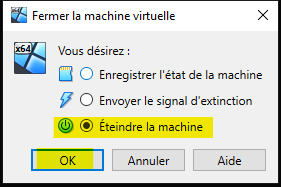 Appuyez sur le X de la fenêtre de la machine virtuelle.