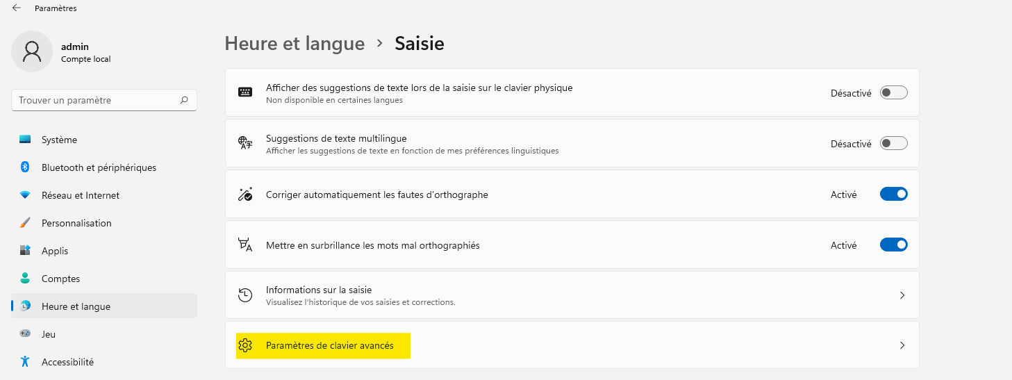 Dans Paramètres -> Heure et langue, appuyez sur l'option Saisie.